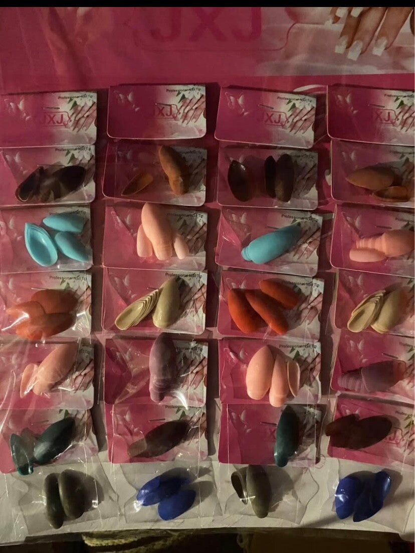 Press on nails of various colours. Easy application with glue. 24 sets in pack.